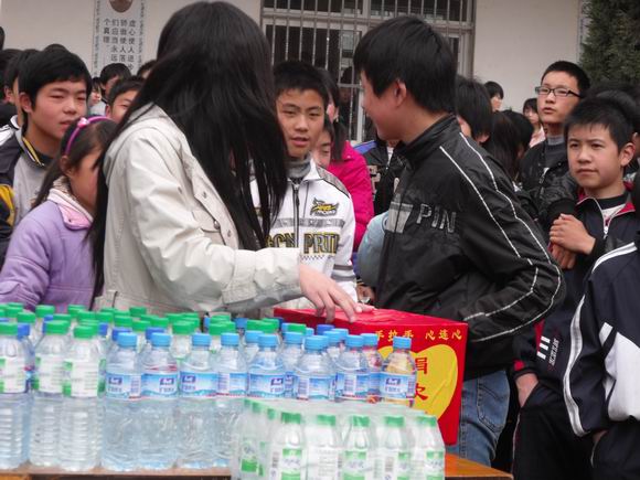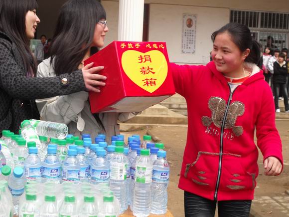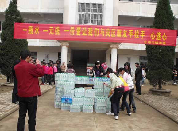 分路口初中团委积极响应镇团委号召,向全校广大团员青年发出倡议:发扬“一方有难,八方支援”的传统美德,慷慨解囊,发起“节约一元钱、捐赠一瓶水——抗旱救灾支援行动”。同学们积极行动起来,以班级为单位,向募捐箱里捐献自己一份爱心,向近期我国一些省区特别是西南地区遭遇历史罕见的特大旱灾,给城乡居民饮水安全带来较大困难,工农业生产造成极大威胁,也给各族群众的生产生活造成了巨大损失的灾区人民表达自己一份心意。