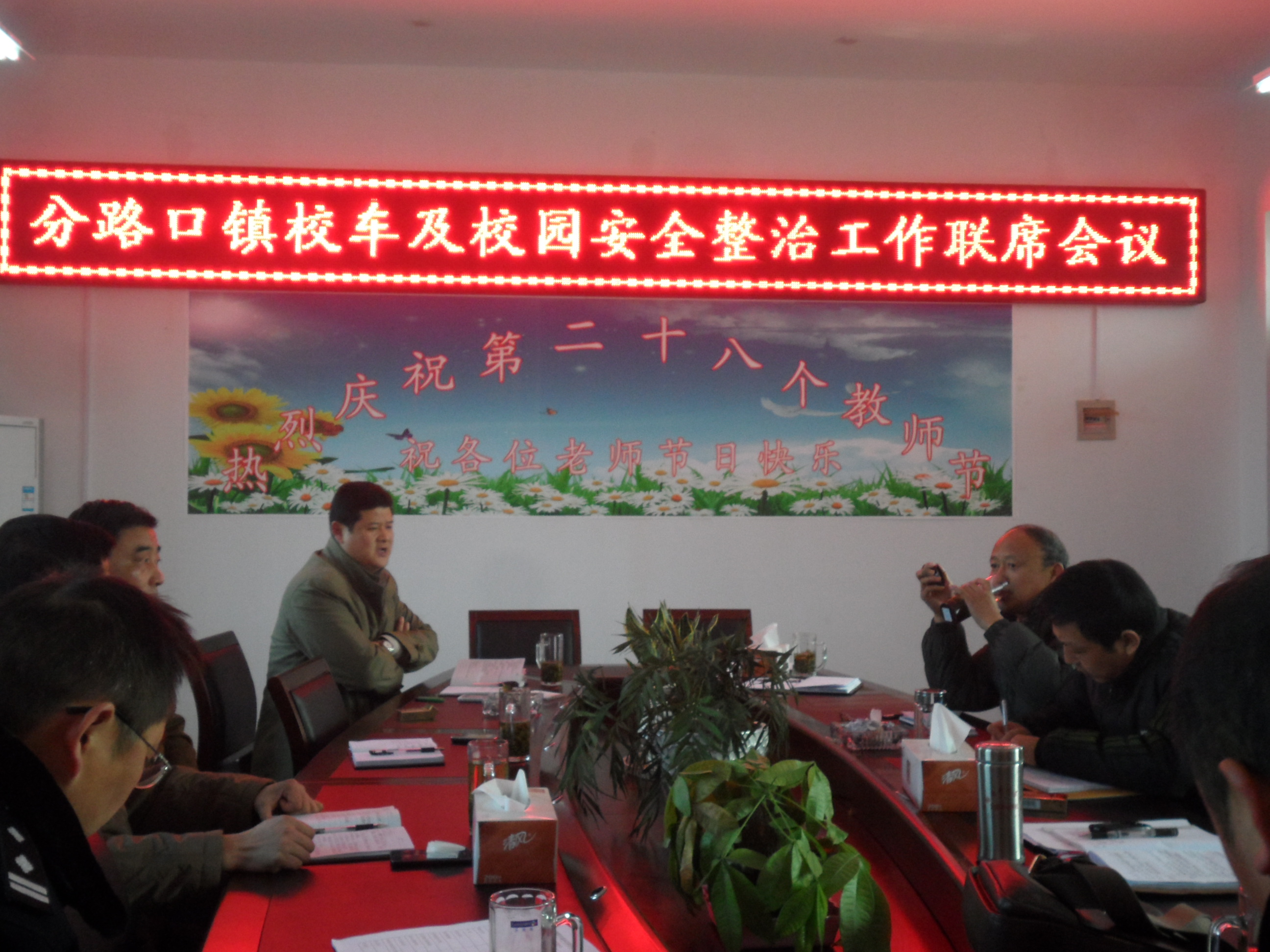2013年1月11号上午,分路口镇在分路口中心学校会议室主持召开校车校园环境整治联席会,分路口镇人大主任孟庆文同志、镇长朱昌盛同志、副镇长鲁先成同志以及镇派出所、交警队、安委会、交通局、中心学校等部门负责人参加了会议。