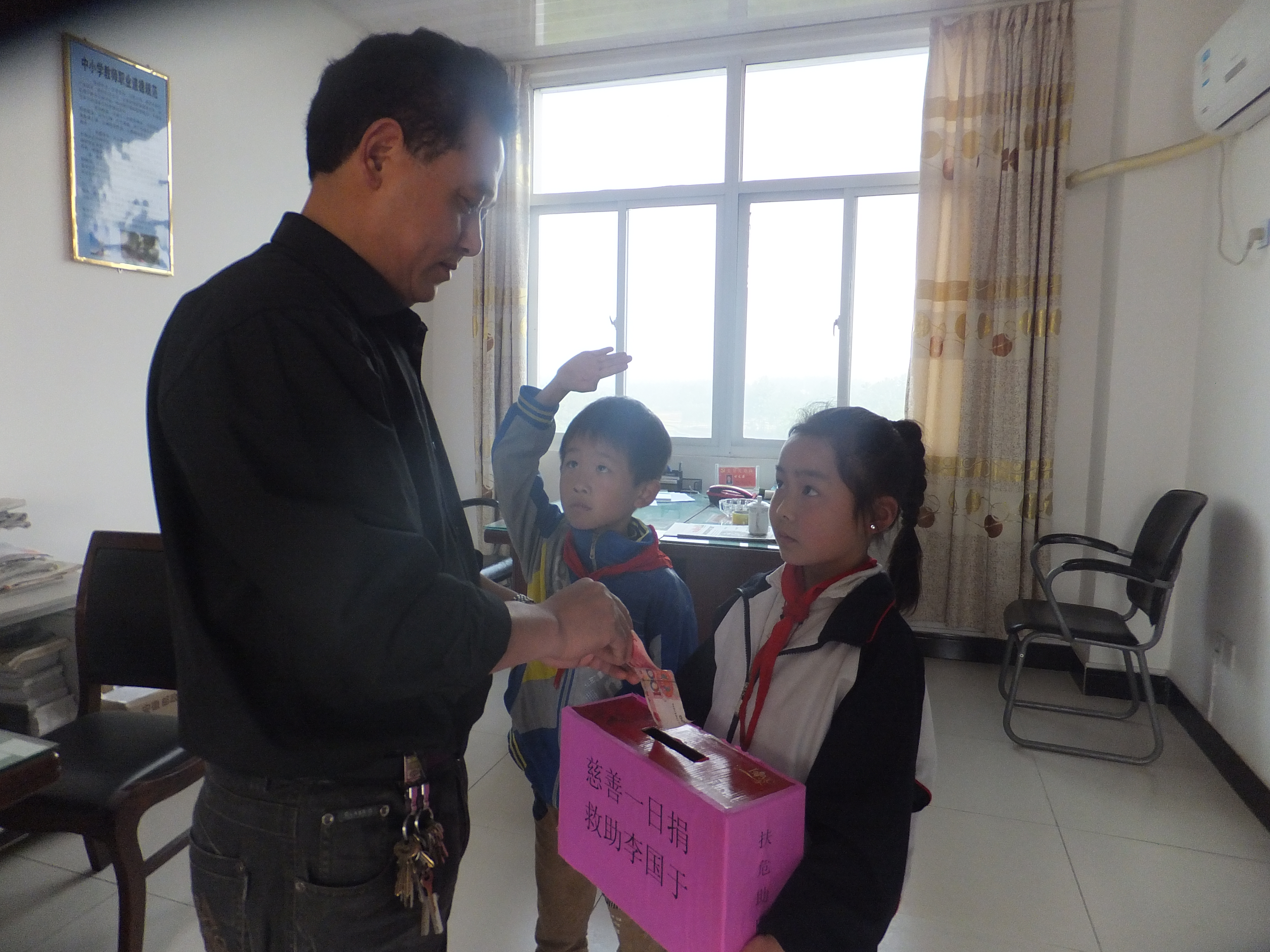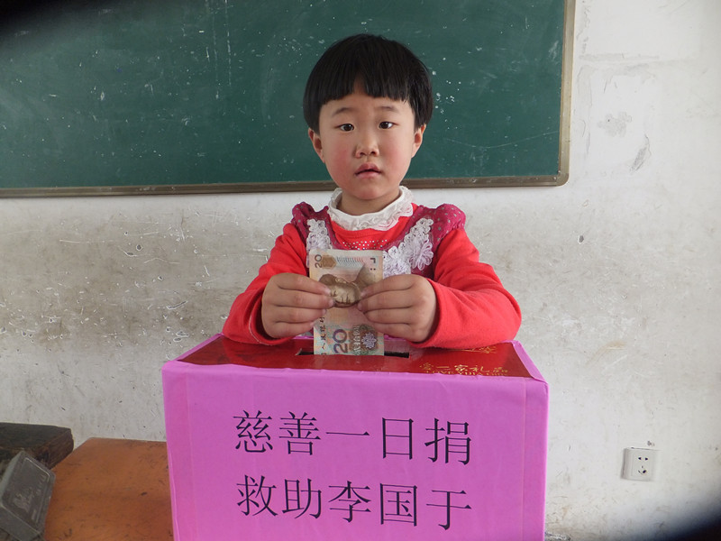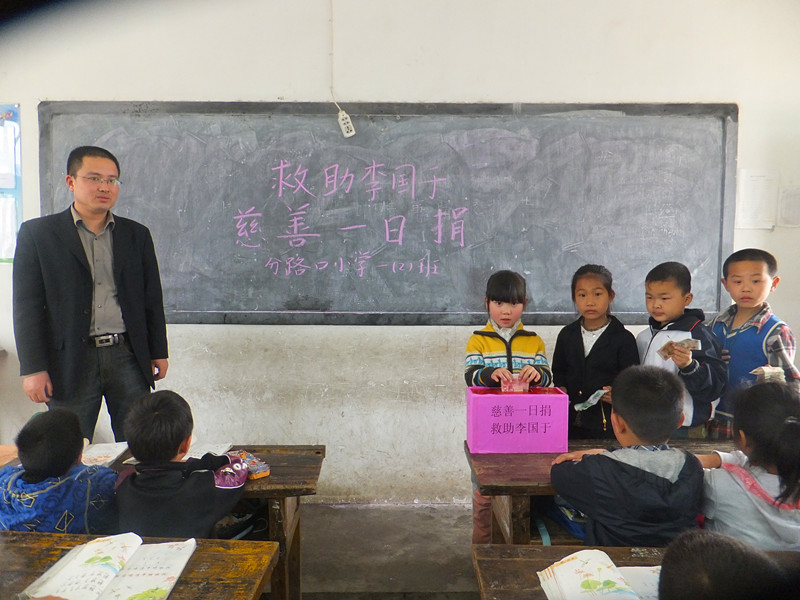分路口小学全体师生得知李国于同学的不幸遭遇后,纷纷慷慨解囊。孙自满校长带头捐款,其他老师积极响应,半小时的时间,教师们就捐款3700元。学生们的行为更是让人感动,有的积极动员家长捐款,有点倒空了自己的储钱罐,有的省下了自己的早餐钱,一双双友爱之手捐出了5角,1元,5元,20元,100元,200元......一天的时间里,学生捐款竟然高达5638.5元。