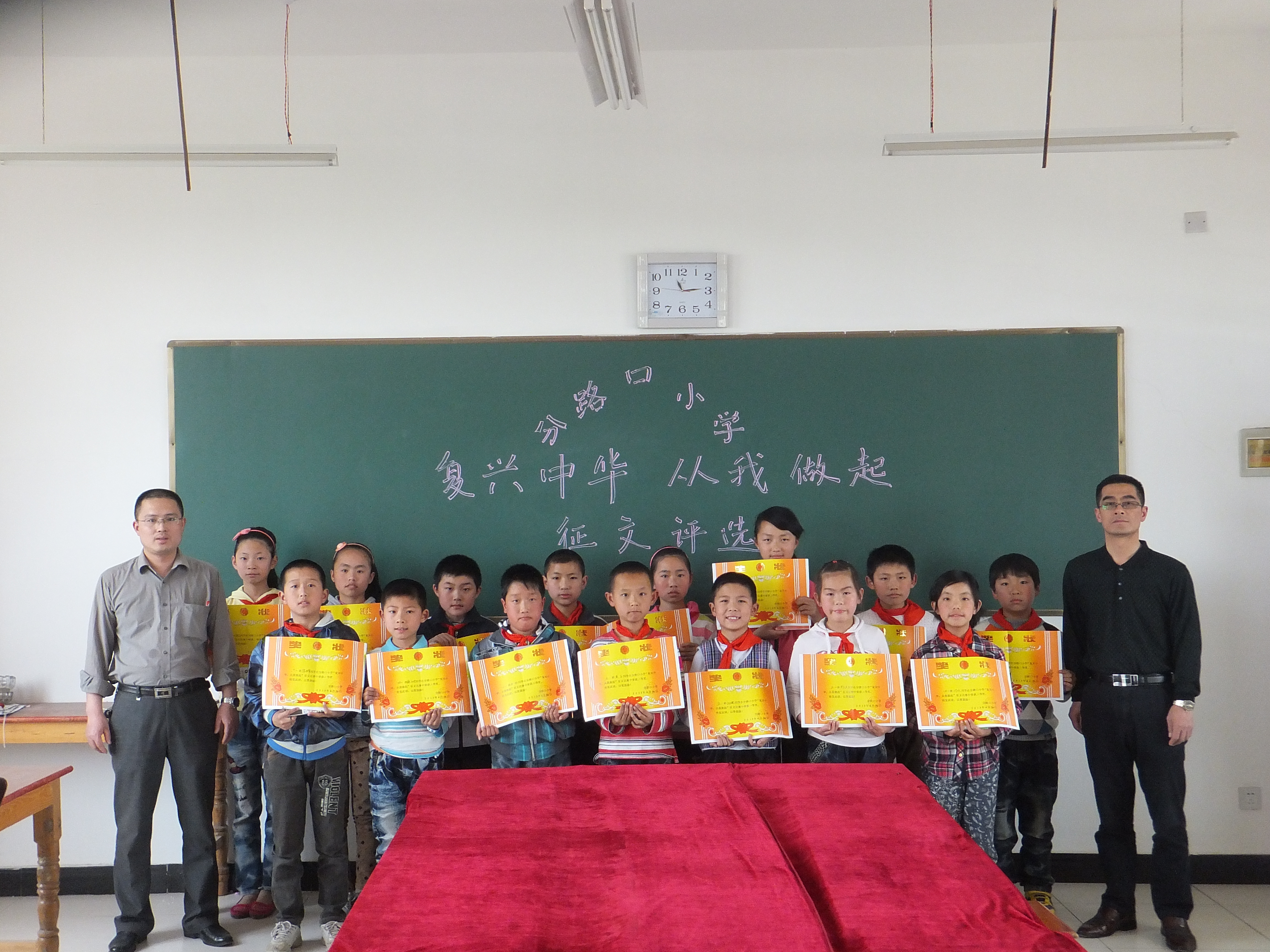 在各班级认真阅读《复兴中华,从我做起》活动读本后,4月26日下午,分路口小学少先大队组织安排了征文和演讲比赛。比赛赢得了四至六年级少先队员们的积极参与。最终,六(1)班张光辉、五(1)班方远鹏获得征文比赛一等奖;六(2)班汪家玉、翁仕欢获得演讲比赛一等奖。