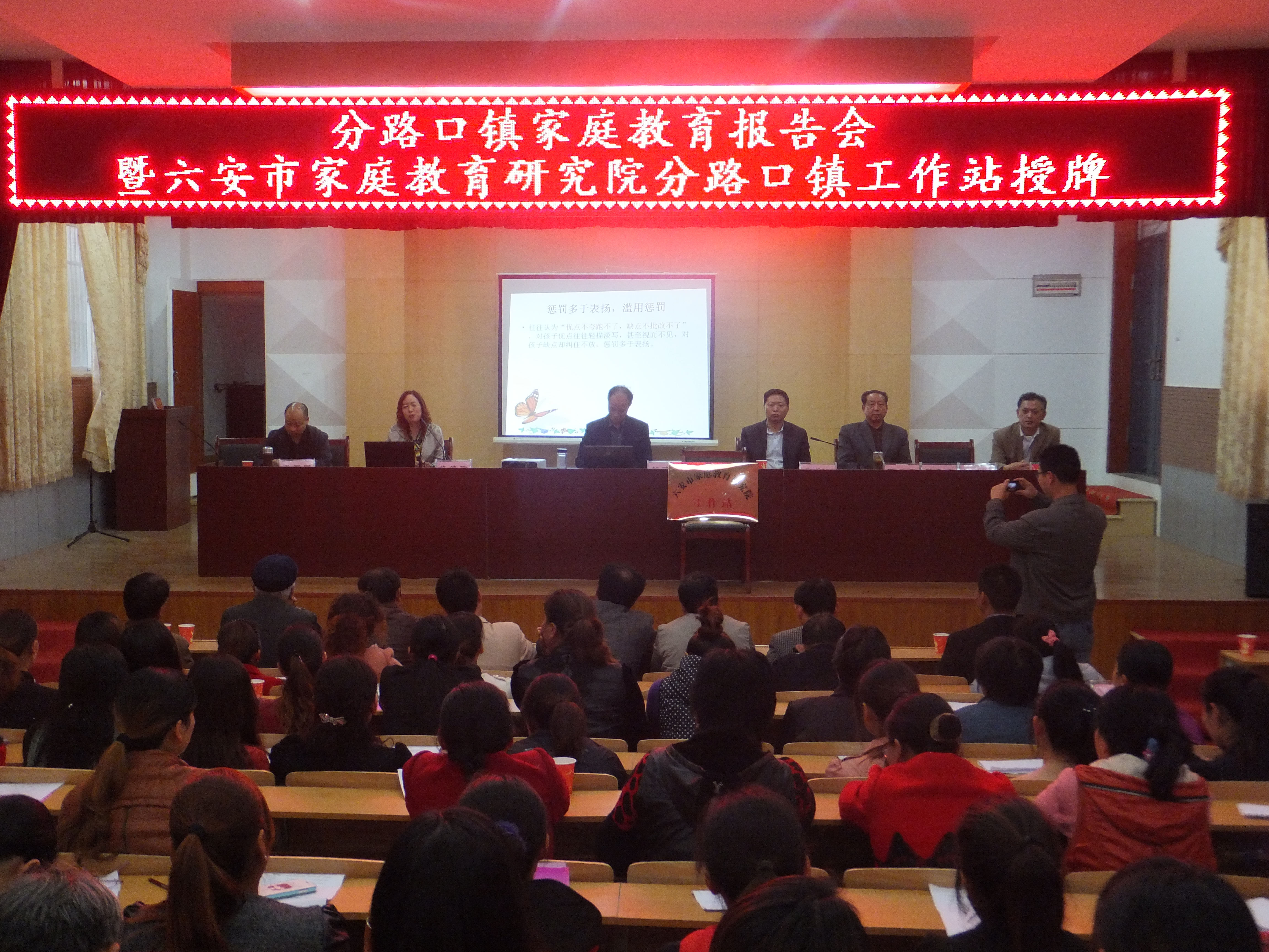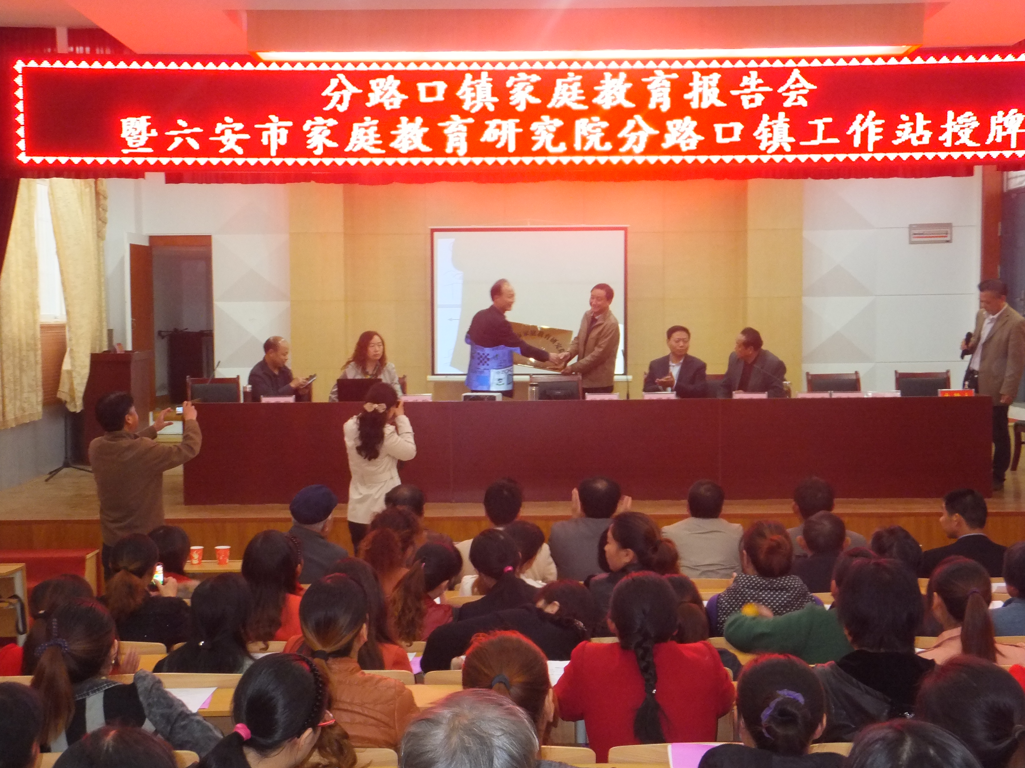 在分路口镇分路口小学报告厅,六安市心理咨询师协会会长、六安市家庭教育研究院常务副院长胡鹏飞,家庭教育专家许纯玲、金曙东,六安市新闻网新闻部主任赵璐,分路口镇关工委主任荣德武,分路口镇“三老办”主任殷永高,分路口镇中心学校校长张家明,分路口镇中心学校关工委主任陈光春和300多名学生家长共同见证了授牌仪式。