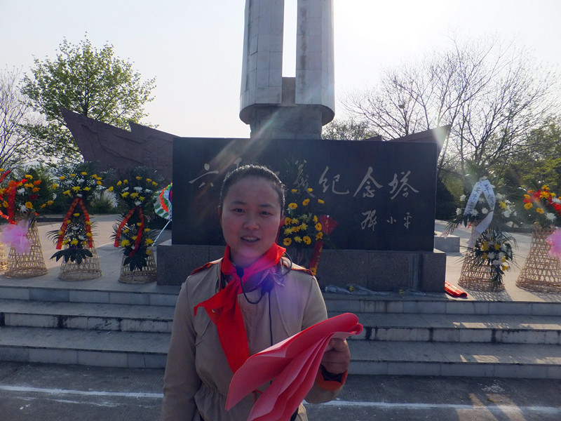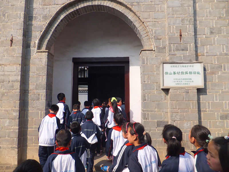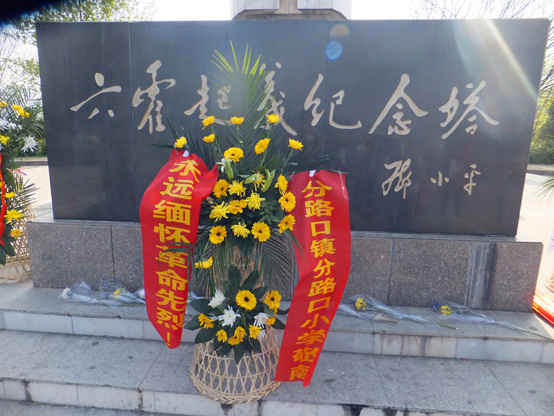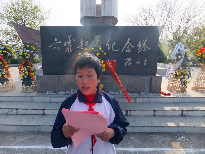 辅导员老师汪先兵、陈于玲、张健和54名少先队员首先参观了六霍起义纪念馆,受到了六霍起义纪念馆工作人员的热情接待。在导游员的引领下,大家边看展品边听讲解,对六霍起义的历史有了深入的了解。随后,导游员还带领大家参观了独山镇老街上的多处革命遗址。参观中,师生们井然有序,兴致勃勃。最后,大家来到六霍起义纪念塔前,向革命先烈敬献了花篮,表达了深切的怀念之情。谢超同学向革命先烈们汇报了少先队员们的生活、学习情况和远大理想。陈于玲老师在讲话中向队员们提出了“缅怀革命先烈,放飞中国梦想”的殷切期望。分路口小学少先大队辅导员张健老师带领队员们在纪念塔前进行了庄严的宣誓:“常怀感恩、勇担责任、追求梦想、报效祖国......”坚定的誓言响彻云霄。