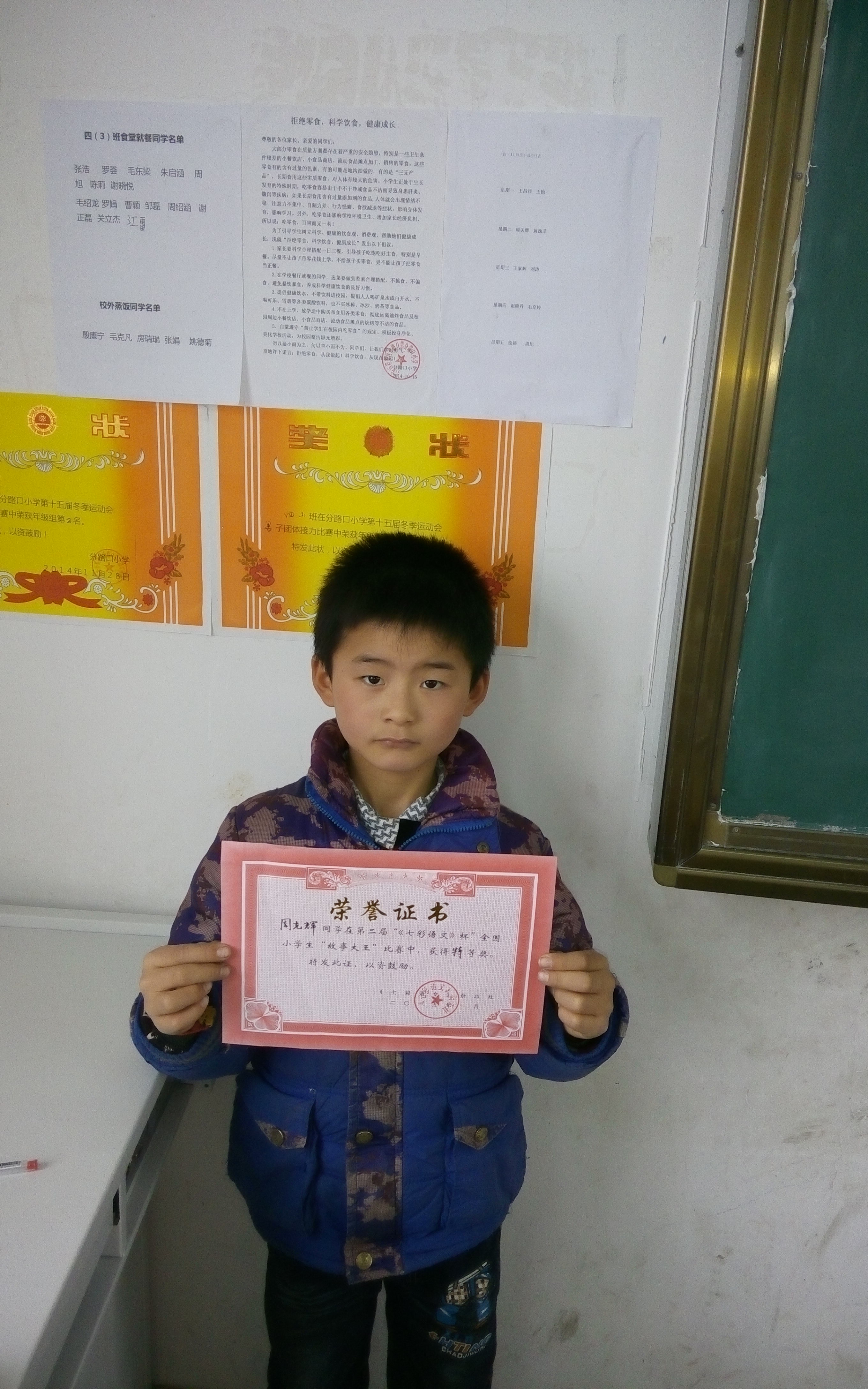 听说周光辉同学获奖后,辛勤辅导他的邹家萍老师也开心不已,她说:“有了周光辉这个好榜样,在不久的将来,分路口小学的同学们在各级各类讲故事比赛中一定会取得更好的成绩……”