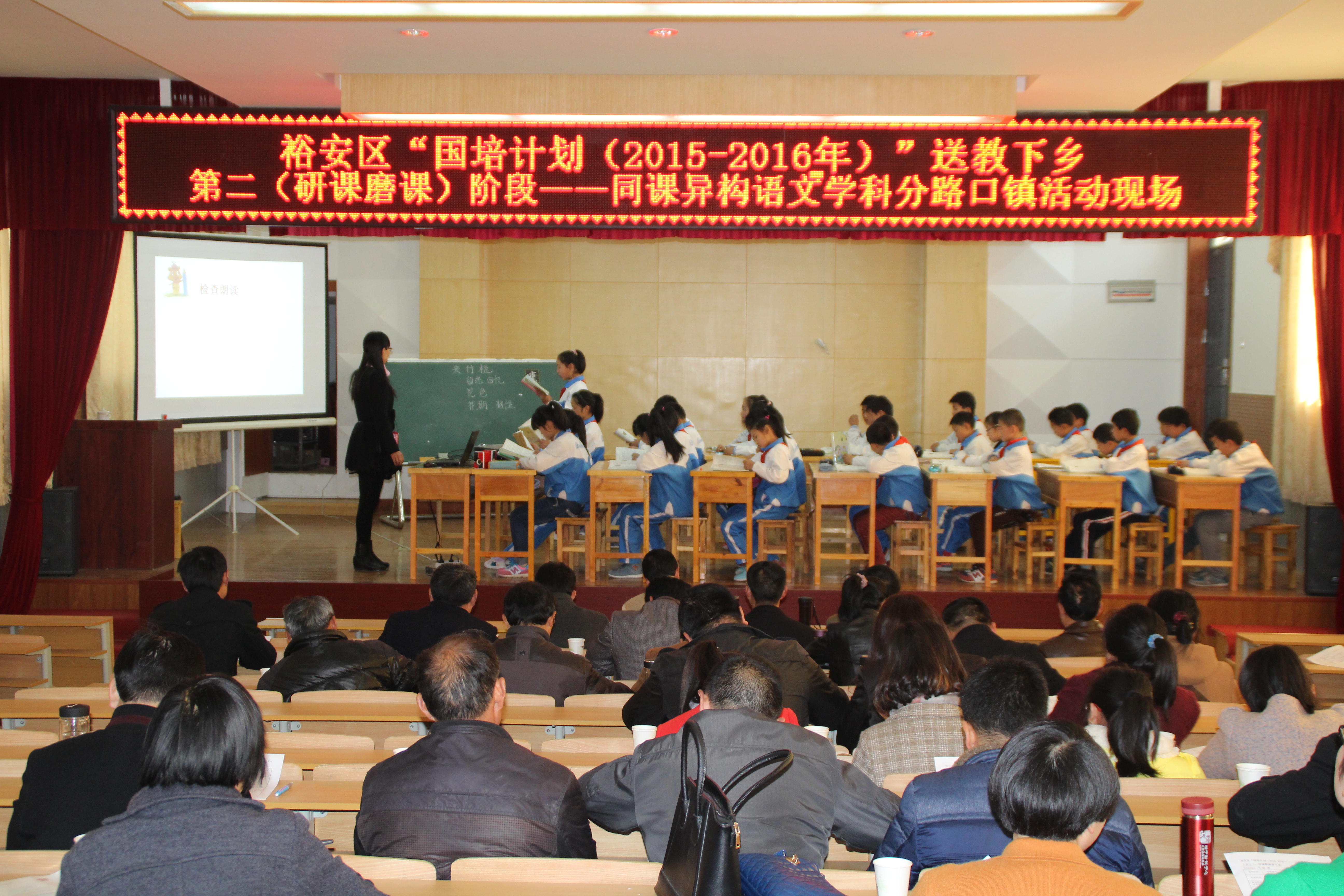 3月25日上午8时许,裕安区“国培计划(2015-2016年)”第二阶段语文学科研课磨课送教下乡活动在分路口小学多功能报告厅成功举行。来自裕安区教师进修学校教导处副主任蔡英树,城北小学教导处主任陈明珩,解放路小学副校长邱燕,分路口镇中心学校副校长朱磊,分路口小学陈慧老师,以及分路口镇50余名语文教师参加了本次活动。